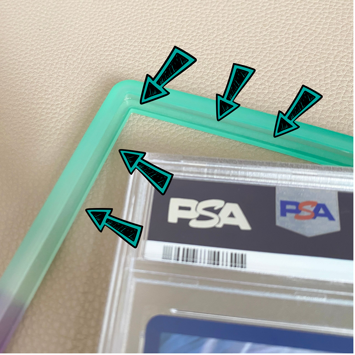 The Slab Me bumper side with the arrows should be facing towards you. Insert your slab with the back of the card facing you as well. Now, gently slide in your graded card and start to click and snap it in place. Easy!